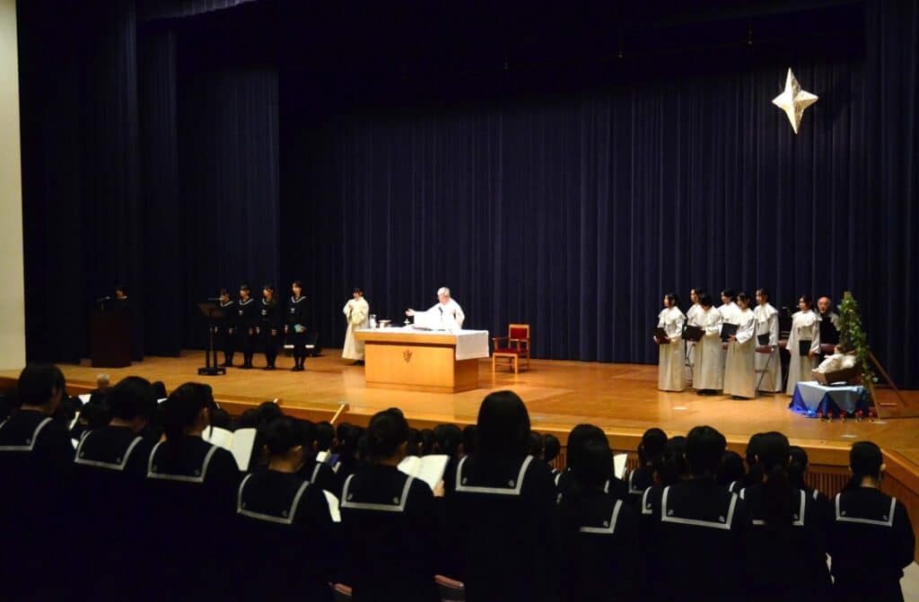 本日は白百合ホールで「クリスマスの集い」が行われました。冬休みを前に全校生徒が集まりミサ聖祭を行い、クリスマスの過ごし方について心を寄せながら、穏やかな時間を共有しました。男女共学前の最後のクリスマスの集いとなり、卒業生や保護者の皆さまも一緒に華やかに主の降誕をお祝いすることができました。