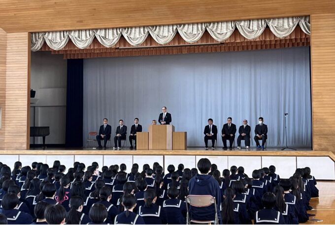 明日の入学式から本格的な共学校となるのを前に、学校長からは「一人一人の違いを『学び』の種として、目の前にいる相手を尊重しましょう。そして一人一人の言動が新しい校風をつくっていくことを忘れず、基本的なルールを大切にしましょう」とお話がありました。式後は、新任の先生方からあいさつをいただきました。